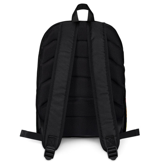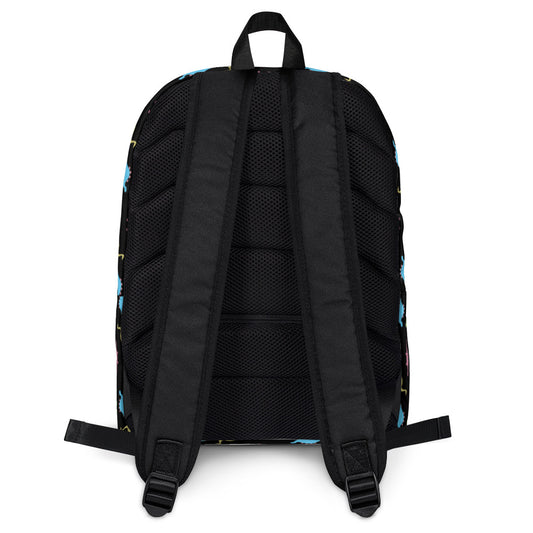 rainbow dino on black backpack